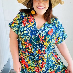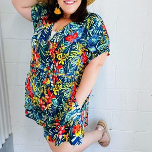 Step into sunshine with our Tropical Romper, a statement piece that channels island vibes with a streetwise twist. Drenched in lush florals—think fiery reds, golden yellows, and deep jungle greens—this romper pops against a rich navy backdrop, creating a wearable canvas of tropical energy.